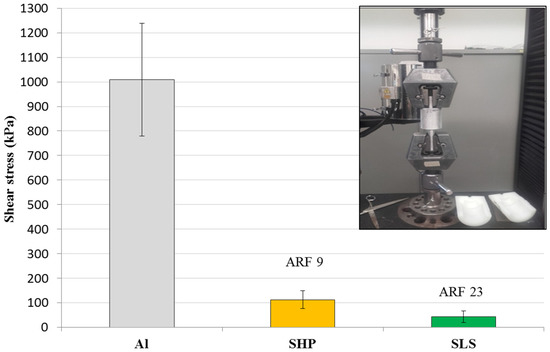 The shear stress force values and the calculated adhesion reduction factor (ARF) are displayed in Figure 5. The ARFs were calculated as the ratio between the shear stress values of bare aluminum alloy and of the samples.