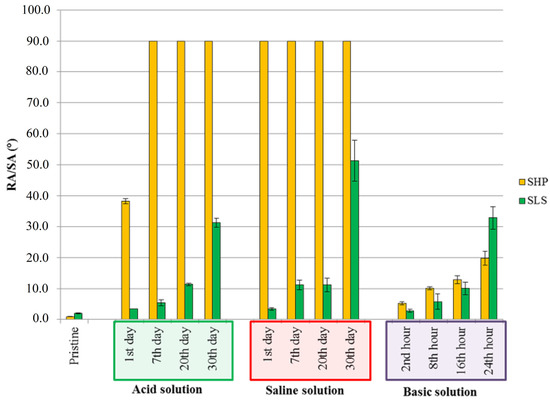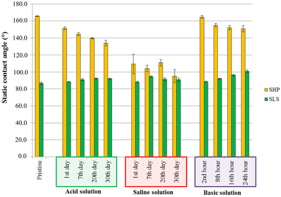 Freshly prepared SLS and SHP samples were used for each test. Different solutions were prepared to assess the durability of each sample in three different conditions: acid (acetic acid, pH = 3), basic (sodium hydroxide, pH = 8.5) and saline (sodium chloride 35 g/L). The as-prepared solutions should assess the resistance in different conditions: the acid solution simulated the pH of an acid rain event, the alkali environment recreated the pH of the seawater and the ionic solution recreated an average sea salt concentration. Samples were completely immersed in this aging solution for different times then rinsed with water and dried under nitrogen. The characterization was done by measuring WCA, contact angle hysteresis (CAH) and RA/SA to assess the variation of hydrophobic properties. Five and three replicated measurements were performed for WCA and for CAH/RA/SA, respectively. Tests were conducted at room temperature to avoid the combination of multiple effects.