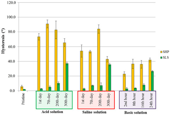 Hysteresis of SHP and SLS after aging in acid, saline and basic solutions.