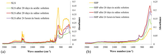 FT-IR of SLS (a) and SHP (b) surfaces after aging in harsh environment.