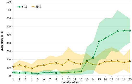 Shear stress tests were repeated twenty times on the same bars for sample SLS and compared to the results obtained for SHP after the same test procedure [12]. The shear stress values are shown in Figure 10.