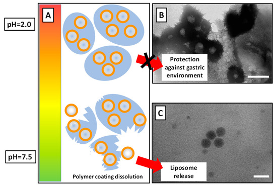Unfortunately, uncoated, non-modified liposomes, are susceptible to combined detrimental effects of gastric acid, bile salts, and pancreatic lipases in the gastrointestinal tract, resulting in reduced concentrations of intact liposomes and payload leakage [23]. For this reason, the development of liposomes addressed to oral drug delivery requires particular modifications, at the level of lipid composition and/or at the level of vesicle coating.