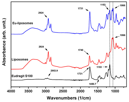 FTIR spectra of Eudragit-coated liposomes and pure liposome were acquired in ATR mode and are shown in Figure 2. The characteristic peaks of Eudragit were at 2953.9 cm−1 because of the presence of O–H (carboxylic acid), at 1731 cm−1 because of the C=O ester stretching, at 1450.7 cm−1 because of –CH3 bend, while the C–O ester signal falls at 1153 cm−1 in accordance with the literature [31]. The liposome spectrum is obviously characterized by lipid signals, including the peak at 1740 cm−1 because of the C=O ester stretching and at 1066 cm−1 because of the C–O ester stretching. Eu-liposomes show the C–O peaks at both the characteristic wavenumbers of the polymer and lipids demonstrating the effective liposome covering. Although in Eu-liposomes the polymer and lipids are organized in separate domains with the Eudragit that externally surrounds the construct, it is reasonable to expect to find both signals in this type of spectra. Indeed in ATR measurement the penetration depth of the evanescent wave in the range 1750 cm−1–1000 cm−1 is approximately between 0.9 μm and 1.6 μm, as previously reported [32], therefore much greater than the thickness of the polymer in the Eu-liposomes as indicated by TEM investigations.
