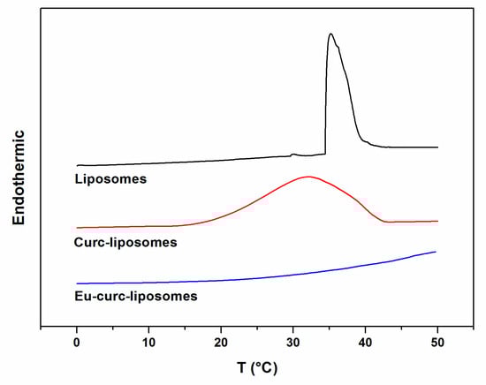 Differential scanning calorimetry (DSC) thermograms of liposomes, Curc-liposomes, and Eu-curc-liposomes.