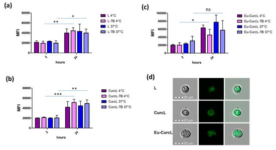 MTT test showed that liposomes, Eu-liposomes, and Eu-curc-liposomes at the final lipid concentration of 1 mg/mL and final Curcumin concentration of 2 µM are not cytotoxic for Caco-2 human colon cell line (data not shown). Liposomes were then evaluated for their uptake by Caco-2 cells, an in-vitro model used for drug uptake and transportation through the intestinal mucosa [37,38]. To assess the effect of short-time incubation at low temperature, Caco-2 cells were first incubated at 4 °C for 15 min, added with liposomes and then incubated at 37 °C for either 2 or 24 h. Other cells were incubated for all the experiment execution at 37 °C. In order to evaluate cell-association or uptake, at the end of the incubation period cells were analyzed as such or after treatment with trypan blue (TB), that quenches the extracellular fluorescence. As can be seen in Figure 4, both cell-associated and internalized liposomes increased at 24 h as compared to 2 h at 37 °C. The increase for cell-associated liposomes was 1.87 fold for empty liposomes, 2.26 fold for Curc-liposomes, and 3.31 fold for Eu-Curc-liposomes for internalized liposomes, the increase was 2.03-fold for empty liposomes, 2.41-fold for Curc-liposomes, and 1.86-fold for Eu-Curc-liposomes. At all conditions, the lack of difference between the mean fluorescence intensity (MFI) values obtained in the absence or presence of TB treatment show that all the cell-associated fluorescence was internalized. Figure 4d shows representative condition of cells at 37 °C for 24 h after treatment with TB. In general, the pre-incubation at 4 °C did not substantially change these outcomes, indicating that a short-incubation time at low temperature does not interfere with the subsequent liposomal uptake.