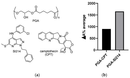 (a) Poly(glycerol-adipate) (PGA) (above), SI214, and Camptothecin (CPT) (below) structures; (b) ΔA% average of the two nano-formulations calculated against the pure drugs in water.