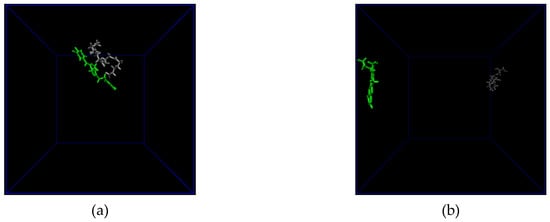The models and forcefield parameters for the study of the interactions were developed as follows: first, the structures of the drugs and dimers of the polymers (PGA, PGA-Me) were created using ChemDraw3D. The structures were submitted to the online Automated Topology Builder (ATB) tool [,] that provided appropriate parameters for use with the GROMOS54a7 [,] force-field. The systems were composed by placing a dimer and a single drug molecule in a box and solvating the system (SPC water model []). After solvation, the atoms were relaxed by 10,000 steps of EM with the steepest descent algorithm followed by an equilibration via NVT ensembles at 298 K (V-rescale thermostat) for 100 ps and then in an NPT ensemble at 1 bar (Berendsen barostat). Bonds to hydrogen atoms were constrained to allow a time step of 2 fs. All of the MD simulations were run with the same barostat and thermostat under PBC. Long-range electrostatics were treated with PME [,].