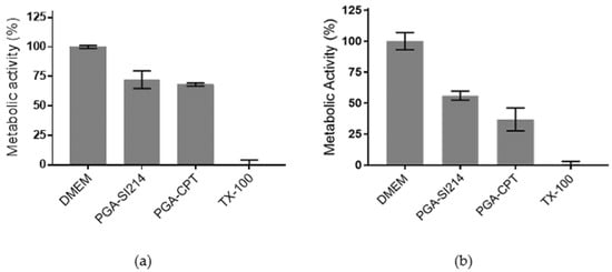 Both bare and loaded PGA NPs showed comparable sizes (range size: 172.3–184.1 nm), and a very narrow size distribution (PdI < 0.033). These data indicated a similar packaging for plain PGA and PGA-SI214 or PGA-CPT (Figure 1a) and a good quality of NPs, respectively. Furthermore, the negative surface charge of NPs (negative zeta potential), due to the free OH of the PGA, conferred NPs stability in an aqueous environment [,,].