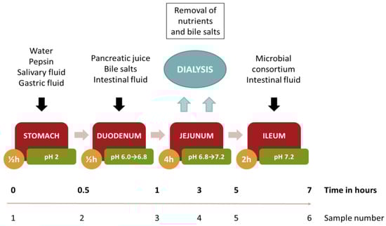 To further validate our results, the stability profile of our nanocomposite was evaluated using the TSI, a dynamic method that simulates the physicochemical conditions found in the human gut. Dynamic models have the advantage over static models to better mimic the physiological changes occurring through the different sections of the human GI tract, e.g., the dynamic variation of pH or the absorption process. The TSI reported by T. Cieplak et al. [] is a small volume in vitro model working under controlled temperature and anaerobic conditions. The TSI is able to simulate the stomach, duodenum, jejunum, and ileum passages (Figure 5) using simulated gastric fluids containing digestive enzymes and the addition/absorbtion of bile salts and inoculation with a representative gut microbiota consurtium along the process.