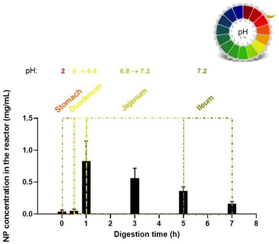 Interestingly, it should be noted that the data variability decreased for the time points after the duodenum phase. This variation in data variability levels could represent a further insight into NP breakdown. Indeed, multiple PC degradation by-products may differently result in shifts and shape variation in the UV-Vis absorbance peak influencing the data variability, as already reported in literature for a comparable dye-PGA conjugate []. This phenomenon should be mainly relevant at the end of the duodenum phase, as the initial burst releases a multitude of PC sub-products, which are produced by NP degradation and retained in the duodenum. Only after reaching the jujenum were the PC sub-products dialyzed, limiting their influence on the absorbance behavior.