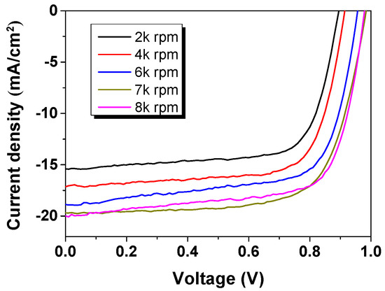 Current density–voltage (J–V) characteristics of perovskite solar cell (PSC) devices based on poly(3,4-ethylenedioxythiophene):poly(styrene sulfonate) (PEDOT:PSS) hole transport layer (HTL) with different coating speeds.