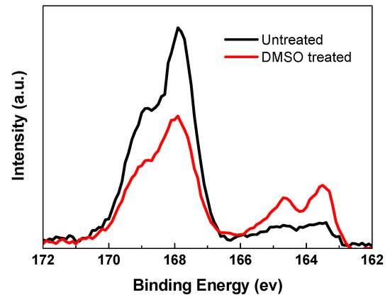 With the DMSO solvent washing treatment, the PSS chains could be removed from PEDOT:PSS, which could be confirmed by XPS spectra (Escalab 250Xi, Thermo Scientific, Waltham, MA, USA). The S 2p has two states: one is from S in PSS (166–172 eV), and another one is from S atoms in PEDOT (162–166 eV). The ratio of S sp XPS intensity in PEDOT to that in PSS is significantly enhanced after treating with DMSO solvent (Figure 2) [41]. The relatively increased PEDOT ratio is contributed to the increased conductivity.