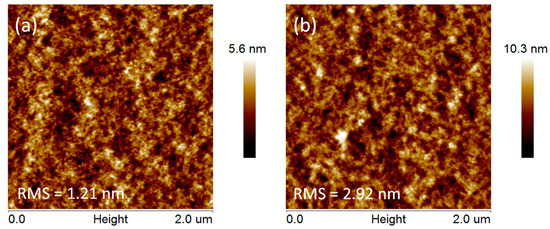 The effect of PSS chain removal from PEDOT:PSS on PEDOT:PSS film surface morphologies was investigated by atomic force microscopy (AFM) techniques (Dimension Icon AFM, Bruker, Billerica, MA, USA). Figure 3 shows the topography images of a 2 × 2 µm2 area of pristine and DMSO solvent treated PEDOT:PSS films. The root mean square (RMS) roughness of pristine PEDOT:PSS thin film was 1.21 nm, indicating a quite smooth surface. After DMSO solvent washing treatment, crystal grains became clearer and the film surface became rougher, resulting in an increased root mean square (RMS) roughness of 2.92 nm. The increased RMS is mainly induced by the PSS chains removal and PEDOT chains aggregation. The increased conducting PEDOT-rich regions lead to superior charge-transport pathways for the treated films. Thus, the PEDOT:PSS film with solvent washing treatment exhibited higher conductivity.