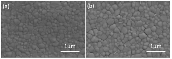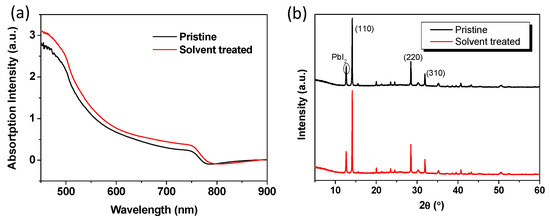 The perovskite thin films deposited on pristine and DMSO solvent washing treated PEDOT:PSS were studied by scanning electron microscopy (SEM, JSM-7800F SEM, Japan). As exhibited in Figure 4, the perovskite film based on solvent washing treated PEDOT:PSS had similar crystal morphology with that of the perovskite film based on pristine PEDOT:PSS. All the perovskite films are uniform with large regular crystallites, and they fully cover the underlying layer. The favorable thin film uniformity and coverage indicate a homogenous nucleation of the perovskites on the substrates. The crystal size increased possibly due to the relatively hydrophobic nature of solvent washing treated PEDOT:PSS, which is beneficial for device performance [42]. In order to illustrate the effect of solvent treatment, we have measured the X-ray diffraction (XRD, Bruker D8 Advance XRD instrument, Billerica, MA, USA) and UV-Vis of the perovskites without or with solvent treatment. Figure 5a presents the UV-vis absorption spectra of perovskites and showed that the film with solvent washing treated PEDOT:PSS exhibited higher light absorption than pristine film. The thin film crystallinity was investigated by XRD, and the XRD patterns of perovskite films with/without solvent treatment are shown in Figure 5b. The diffraction peaks around 14.21°, 28.51°, and 31.88° are assigned to the (110), (220), and (310) crystal planes, respectively, which indicates that the perovskite film is formed with good quality. Meanwhile, the PbI2 peak around 12.6° appeared, and the exceed PbI2 could efficiently passivate the perovskite grain boundaries and reduce trap density as reported [16,43]. Moreover, the solvent washing treated PEDOT:PSS produced higher crystallinity of treated film than that of pristine film. This improved film crystallinity has positive effect on charge transport and charge extraction.