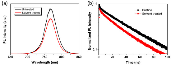 (a) Steady-state photoluminescence (PL) and (b) TR-PL spectra for perovskite films based on pristine and DMSO solvent washing treated PEDOT:PSS layers.