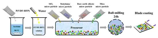 The preparation of the radiative cooling coating is illustrated in Figure 1. Firstly, 2 g of P(VDF-HFP) raw material (Sigma-Aldrich, Shanghai, China) was dissolved in 35 g acetone to form the P(VDF-HFP) solution. Then, 2 g deionized water was added into the solution to make a P(VDF-HFP)-acetone-water precursor solution. Next, 0.2 g SiOx (Aladdin Chemicals, Shanghai, China), 0.6 g mica (Mineral Products, Shijiazhuang, China), 0.8 g rare earth silicate, and 0.2 g molybdate nanoparticles were added to the precursor solution. After ball-milling for 24 h, the nanoparticles were randomly dispersed into the precursor solution. Finally, the disperse system was used to produce the radiative cooling coating on a PET aluminized film by blade coating. The obtained coating was coated evenly onto the PET aluminized film and was white in color.