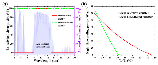 (a) IR emissivity/absorptivity of ideal broadband emitter and selective emitter; (b) Theoretical nighttime cooling performance of ideal broadband emitter and selective emitter with relative humidity 60%.