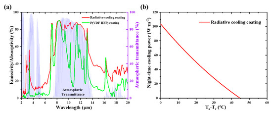 (a) IR emissivity/absorptivity of poly(vinylidene fluoride-co-hexafluoropropene) (P(VDF-HFP)) coating and radiative cooling coating; (b) Theoretical nighttime cooling performance of radiative cooling coating with relative humidity 60%.