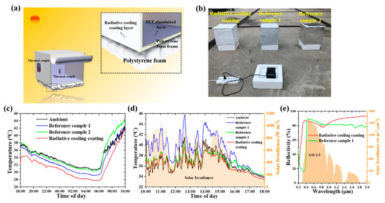 The rooftop measurement apparatus and the testing results: (a,b) The schematic and picture of the testing apparatus, respectively; (c,d) Nighttime (29 July 2019) and daytime (23 July 2019) test results of the rooftop measurements, respectively; (e) Solar reflectivity of the radiative cooling coating and commercial cooling coating.