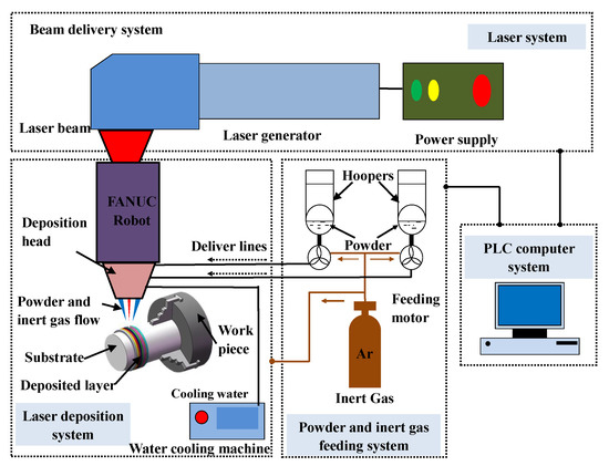 Laser cladding is a widely used surface engineering technology which applies high density laser energy to the substrate with additive powder to rapidly obtain metallurgical bonding and significantly improve mechanical, physical, and chemical properties of the substrate surface, such as wear, corrosion, and oxidization resistance [1,2]. Due to its low dilution, small distortion, and better surface quality compared with conventional processes, laser cladding technology has been implemented in numerous fields like metallurgical mining, energy transportation, machinery manufacturing, and aerospace [3,4].