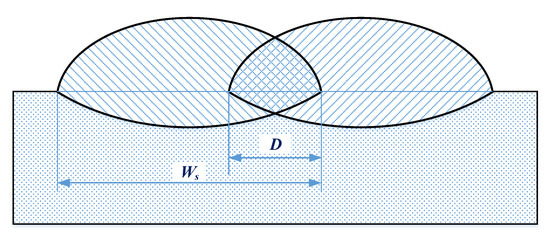 RSM is a comprehensive optimization method for experiment design and modelling. Compared with orthogonal design, RSM is capable of establishing correlations between targets and influencing factors with high accuracy but lower experiment cost [19,20]. We used central composite design to produce an experimental matrix for four factors with five levels (Specifically, 24 axial points and 6 replicated centre points). The four investigated factors were powder ratio (PR) of TiC, laser power (LP), defocusing distance (DD), and overlapping ratio (OR). Table 4 illustrates the studied factors and their levels. The detailed experimental matrix was obtained according to CCD as illustrated in Table 5. A laser beam of 4 mm in diameter was obtained when focused on the substrate surface. OR is the ratio of overlapped distance (D) between two adjacent passes to the width of single pass (), as demonstrated in Figure 3. The ranges of the four variables were selected based on previous investigation. Other parameters were remained constant: scanning speed = 7 mm/s and gas-powder flow rate = 1100 L/h.