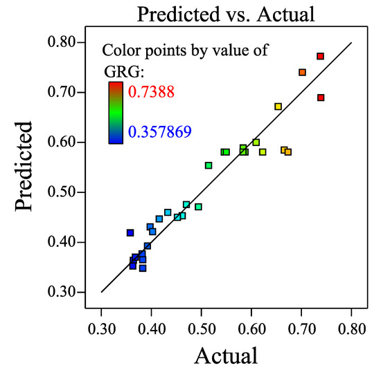 Table 13 shows the results of the ANOVA for the response GRG using stepwise regression to eliminate the insignificant factors. The table shows that the p-value of model Prob(F) was less than 0.01% and lack-of-fit was greater than 73.78%, indicating that the correlation model has an existence probability of more than 99.99% and the lack of fit is caused by ambient random noise. Therefore, the selected model presented good fitting accuracy with respect to the studied factors. The value of adequate precision was 17.469, indicative of high model resolution. The coefficients of determination, , adjusted , and predicated were all approximate to one. The difference between the adjusted and predicted was less than 0.2. The geographical comparison between the predicted and experimentally obtained GRG values is illustrated in Figure 5. The closeness of data points to the line also indicates their minimal divergence. Thus, the selected model for GRG is capable of explaining the process and has good prediction accuracy.