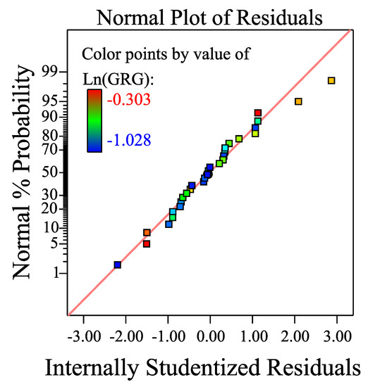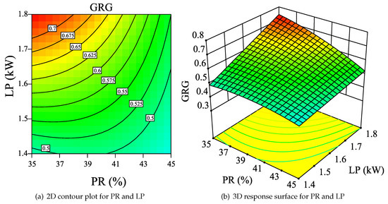 To optimize the process parameters for multi-pass laser cladding, it was necessary to establish the correlation between the process parameters and the GRG values. Through significance analysis of GRG values, as depicted in Table 12, a natural logarithm transformation of GRG was well described as a quadratic model of the investigated parameters. By identifying the regression coefficients, the response surface model of GRG was obtained as shown in Equation (18).