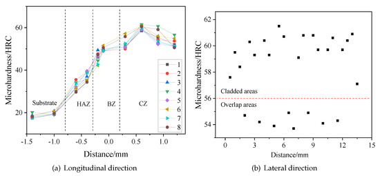 The microhardness in the lateral direction was measured every 0.5 mm at a distance of 0.6 mm outward from the substrate, as depicted in Figure 11b. The microhardness along clad passes fluctuated slightly about 60 HRC, except for two points at the clad edges. In addition, the overlapped area was softer than other areas in the cladding layer due to coarser grain produced due to the remelting effect [35].