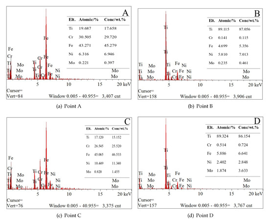 Figure 12 shows the microstructure of the optimized clad layer. The microstructure of the clad area was mainly comprised of dendrite and cellular TiC, as demonstrated in Figure 12a, whereas petal shaped cellular grain was found in the overlapped area (Figure 12b). This occurred due to the heating effect of the former pass and remelting of the overlapped area, which facilitated grain growth. The EDS results at points A–D, as shown in Figure 13, suggest element dispersion during laser cladding compared with the chemical composition of cladding powder.