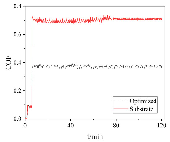 Figure 14 compares the wear resistance results of the substrate and cladding layer with the optimized process parameters in the test configuration as illustrated in Table 16. The coefficient of friction reduced from 0.72 to 0.38 by adding the cladding powder. The worn surfaces of the substrate and the optimized cladding layer are macroscopically compared in Figure 15. The worn surfaces of both samples had similar profiles with sloughing scratches parallel to the sliding direction. The profile width of the substrate was larger than that of the optimized clad laye, mainly due to the reinforcement addition of hard phase TiC, which has better wear resistance than the -Fe. 3D profile of worn surfaces, as depicted in Figure 16, suggesting that the substrate was also deeper than that of the optimized clad layer. The wear volume of both samples were computed to be 4573.68×10 mm and 562.13×10 mm, respectively. Therefore, the wear resistance of the substrate can be improved by about 8.14 times by applying the clad layer under the optimal process conditions.