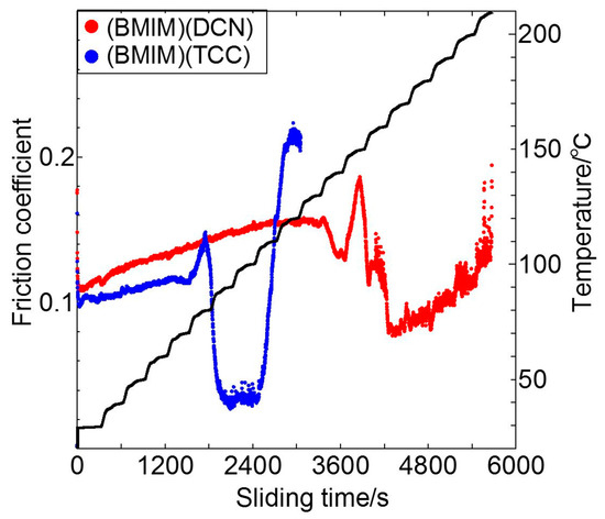 Friction behaviors of (BMIM)(DCN) and (BMIM)(TCC) at elevated temperatures.