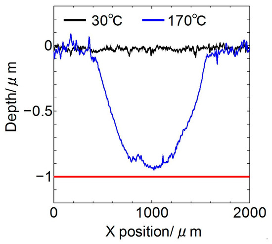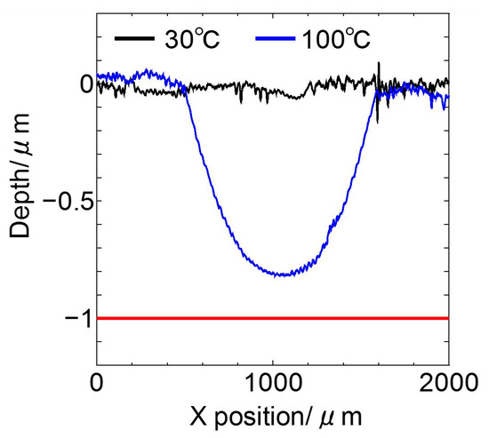 Figure 1 shows the frictional behavior of each cyano-based ionic liquid at an elevated temperature. In the case of (BMIM)(DCN), the friction coefficient gradually increased with the temperature. A reduction in friction was observed at 170 °C. The friction coefficient was approximately 0.07. After this, a sharp increase in the friction coefficient was observed at 210 °C, because the ta-C film might have peeled from the substrate. When (BMIM)(TCC) was used, the friction coefficient gradually increased with the temperature. At 90 °C, the friction coefficient decreased to approximately 0.03. A sharp increase in the friction coefficient was then observed at 110 °C, which confirmed that the temperature affected the reactivity of the ionic liquids. We performed the sliding test at a constant temperature and confirmed the time-dependence of the friction coefficient to clarify the effect of temperature. Figure 2 shows the frictional behavior of the ionic liquids at 30 °C, and the temperature at which a low friction coefficient was achieved. To determine the temperature corresponding to the low friction coefficient of the ionic liquids, friction tests were conducted at 170 °C and 100 °C for (BMIM)(DCN) and (BMIM)(TCC), respectively. Figure 3 shows an image of the worn surface of the ta-C film obtained with a laser microscope. Figure 4 and Figure 5 show the worn surface profiles of the ta-C film lubricated with each ionic liquid. At 30 °C, both ionic liquids showed stable friction behaviors and small surface wear. At the temperature corresponding to the low friction coefficient, the reduced friction of each ionic liquid was confirmed. Further, the progression of wear was confirmed in comparison with the results obtained at 30 °C.