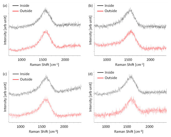 The structural changes in the wear track of ta-C films were investigated by Raman spectroscopy (inVia Raman Microscope, Renishaw, Gloucestershire, UK). The Raman spectrometer used a 532 nm YAG laser with a maximum output power of 2.5 mW in conjunction with an objective lens at 50x magnification. The Raman spectra of the amorphous carbon showed some prominent features (D-peak at approximately 1300–1400 cm−1 and G-peak at 1500–1600 cm−1) [34]. The increase in the ratio of the D-peak to G-peak intensities (ID/IG) indicates the degree of graphitization of the ta-C film [35]. Graphitization (increase in ID/IG) of the film is known to influence the friction behavior [36]. In this study, the degree of graphitization was estimated by calculating the ID/IG ratio.