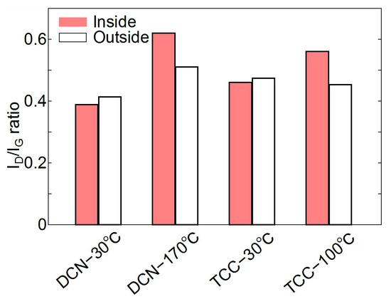 Raman spectroscopy was performed to investigate the structural changes in the ta-C film. Figure 6 shows the Raman spectra of ta-C films after each sliding test when lubricated with (BMIM)(DCN) or (BMIM)(TCC). Figure 7 shows the ID/IG ratio of the ta-C films. The interior and exterior parts of the wear track of the ta-C films were analyzed. At 30 °C, no major difference was observed between the interior and exterior parts of the wear track. The graphitization proceeded on the worn surface at the temperature corresponding to the low friction coefficient. It is possible that the graphitization of the ta-C film was responsible for the reduced friction.