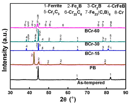 - As the chromizing time increases, the phases of the B-Cr duplex-alloyed coating vary significantly. The BCr-15 coating is composed of ferrite and borides (Fe2B, Cr2B, and CrFeB), while the BCr-30 coating contains ferrite, borides (Fe2B, Cr2B, and CrFeB), and a small amount of chromium carbide Cr7C3. Pure Cr, chromium boride Cr2B, τ-phase Fe23(C,B)6, and chromium carbides CrxCy (Cr7C3 and Cr23C6) are detected in the BCr-60 sample.