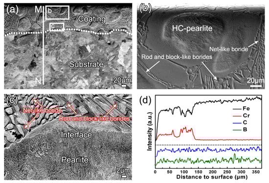 The microstructure and element distribution of the BCr-15 sample are presented in Figure 3. After chromizing, the coating morphology is remarkably different from that of the PB sample. The original B-coating consisting of columnar Fe2B grains changes to a coating composed of a great number of equiaxed grains and second-phase particles (see Figure 3a,b). From Figure 3d, it can be seen that the Cr element has penetrated into the original B-coating, but the content of Cr in the coating is lower than that of Fe. According to previous studies [14], the equiaxed grains are determined as the pearlite with high content of Cr element (HC-pearlite, hereafter). The second-phase particles mainly present three morphologies: net-like, rod-like, and block-like, as shown in Figure 3b, c. It has been reported that with the addition of Cr element in the Fe-B alloy, the continuously distributed net-like eutectic Fe2B structure is scattered, changing into dispersed M2B-type boride structures (mainly containing (Fe,Cr)2B, CrFeB or Cr2B) [43]. The XRD patterns also confirm the presence of Fe2B, CrFeB, and Cr2B phases in the BCr-15 sample (see Figure 1). Thus, it can be confirmed that the net-like phase is Fe2B, the rod-like and block-like structures are composed of CrFeB and Cr2B phases (see Figure 3c). Such hard borides have been widely reported in the literature [24,44,45].