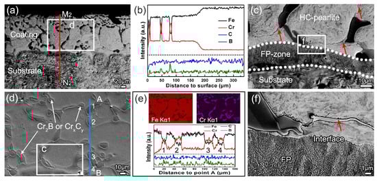 Figure 5 presents the microstructure and EDS results of the BCr-60 sample. From Figure 5a, it can be seen that the coating is also composed of HC-pearlite and second-phase particles. However, only block-like particles are observed in the entire coating. Moreover, such block-like particles are mainly distributed at the grain boundaries (see Figure 5d). According to the EDS results (see Figure 5b,e) and XRD patterns (see Figure 1), it can be inferred that the block-like structure consists of Cr2B and CrxCy (Cr7C3 and Cr23C6). This result is consistent with our previous study [14]. That is, as the chromizing time further increases, the net-like and rod-like borides gradually disappear, and only the block-like phase (Cr2B and CrxCy) is retained. In addition, some band-like particles (marked by red arrows in Figure 5c,f) are distributed at the phase boundaries of Cr2B (or CrxCy) and the grain boundaries of HC-pearlite. Such band-like particles are determined as τ-phase Fe23(C,B)6 according to the XRD analysis and the literature [14,47]. A fine pearlite zone (FP-zone) can also be observed at the interface between the coating and substrate, as shown in Figure 5c,f. It indicates that some Cr atoms have diffused into the substrate. It is because that the formation of FP-zone is resulted from the refinement of the pearlite structure by the Cr element in solid solution of the steel matrix [11]. It can be summarized that as the chromizing time increases, the net-like and rod-like borides distributed on the HC-pearlite grains disappear, and completely change into the block-like structures of Cr2B and CrxCy which mainly distribute at the grains or phase boundaries.