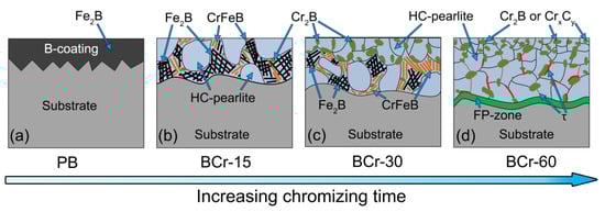 Figure 9 shows sketch maps of the microstructure evolution during pack-chromization. The schematic microstructure of the pre-boronized sample is depicted in Figure 9a. Previous investigations have discovered that the efficiency of induction-heating is much higher than that of traditional resistance furnace heating, and the diffusion rate of each atom is larger as well [10,11,14]. It is known that Fe2B begins to decompose at about 900 ~ 1000 °C during the heating process [47], and then the B atoms start to diffuse into the Cr-layer and substrate. For the BCr-15 sample, the concentration of B atoms will decrease during chromizing due to the diffusion of B atoms. Therefore, the dense Fe2B having a columnar grain structure mainly becomes the continuously distributed net-like structures after cooling to room temperature (see Figure 9b). At the same time, Cr atoms originating from the packed powders also diffuse into the coating. Some Cr atoms are dissolved into the iron lattices, while some react with the B atoms to form the M2B-type borides (Cr2B and CrFeB). When the chromizing time further increases, more and more Cr atoms diffuse into the B-coating. Due to the high concentration of Cr atoms in the outer layer of the coating, a great number of block-like Cr-rich structures (Cr2B) are formed in the upper layer of the coating (see Figure 9c). In addition, the number of rod-like phase also increases. However, the continuously distributed Fe2B structures are obviously scattered, and gradually tend to disappear (see Figure 9c). From Figure 9d, it can be seen that most of the second-phase particles present block-like structure, and the rest present band-like after chromizing for 60 min. This is because that a large fraction of B atoms react with the Cr atoms to form the Cr2B phase as a result of the further increase of Cr concentration. Meanwhile, the C atoms also move from the substrate to the coating, owing to the low carbon potential in the coating caused by the addition of carbide forming element Cr [13]. Consequently, the block-like chromium carbides CrxCy (Cr7C3 and Cr23C6) are formed. It should be noted that the Cr has a larger interstitial lattice site and a lower atomic packing factor, so the solid solubility of B and C atoms in Cr is much higher than that in Fe [11]. This is a dominant reason for the formation of Cr2B and CrxCy. The formation of τ-phase (band-like structure) has been researched in other studies [14,47]. Moreover, the presence of fine pearlite zone (FP-zone) is also attributed to the Cr addition [11,53].