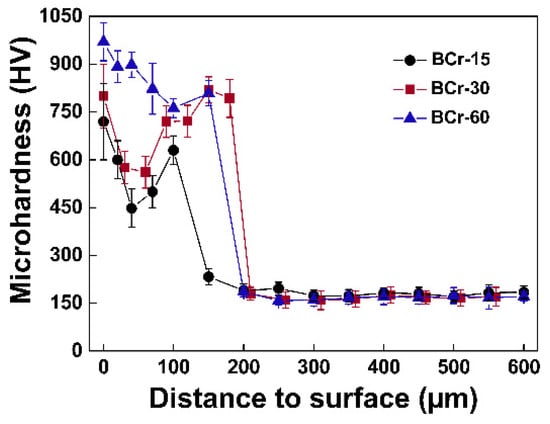 Figure 10 exhibits the sectional microhardness curves of various samples. It can be seen that the hardness of the coatings is far higher than that of the steel substrate. The hardness of pure oriented Fe2B crystals with high brittleness reaches up to 1760~1880 HV [54]. Generally, the microhardness of the boronized coating is about 1600 HV [14,47], which is higher than that of Cr2B, CrxCy, and HC-pearlite. The microhardness of reticular Fe2B is considered to be lower than that of Fe2B with a compact columnar grain structure, resulting in that the microhardness of the duplex-alloyed coatings is lower than that of the single boronized coating. Overall, the average hardness of the coating increases remarkably with increasing chromizing time. This is attributed to the continuous diffusion of Cr atoms from powders to the coating [55]. Aghaie-Khafri et al. [24] also have proved that the microhardness of B-Cr duplex coating increases with increasing heating time. Moreover, all the three samples have the peak hardness on the coating surface, measured as about 720, 800, and 970 HV, respectively. But the difference is that in the coating, as the distance from the surface increases, the hardness of the BCr-60 sample decreases linearly, while the BCr-15 and BCr-30 samples decrease first and then increase. The results show that as the chromizing time increases, the net-like Fe2B and rod-like CrFeB phases gradually disappear, and finally completely transform into the block-like Cr2B and CrxCy (Cr7C3 and Cr23C6) phases in the coating. This is because that with the increase of chromizing time, the net-like Fe2B and rod-shaped CrFeB phases with lower hardness are gradually replaced by the block-like Cr2B and CrxCy with higher hardness. This difference in hardness distribution also proves that the phase and structure of the coating vary as the chromizing time increases.