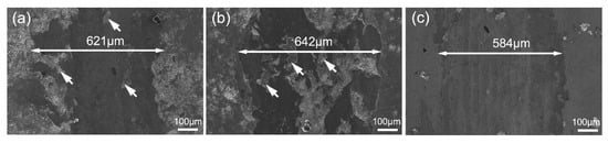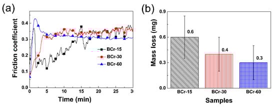 The mass loss of the three samples is shown in Figure 12b. Obviously, the mass loss of the BCr-15 and BCr-30 samples is larger than that of the BCr-60 sample, due to the lower surface hardness (see Figure 10) and surface exfoliation (white arrows in Figure 11a,b). This further confirms that the BCr-60 coating has a better friction-related wear resistance.