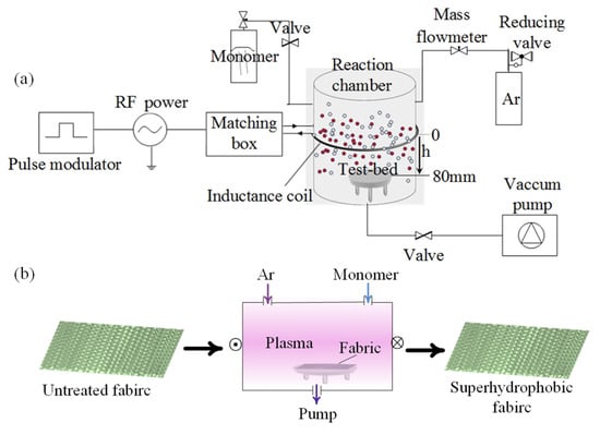 Schematic diagram of (a) the plasma reaction device and (b) the technological process of preparing the super-hydrophobic cotton fabric.