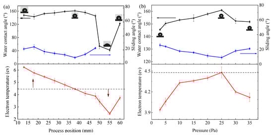 The active particles in the ICP reaction chamber are generated near the coil and diffused around. The average electron temperature changes with the processing position and pressure. The electron temperature has a significant effect on the super-hydrophobicity of the plasma-treated cotton fabric surface (Figure 2a,b). Further, the process position plays a more significant role than gas pressure on the electron temperature. The best hydrophobicity (WCA = 160.95°, SA = 9.01°, Video S1) for the plasma-treated cotton fabrics was achieved with an electron temperature of 4.46 eV at a process position of 38 mm and a pressure of 25 Pa. On the one hand, when the electron temperature was higher than 4.46 eV, the water repellency of the plasma-treated cotton fabric surface increased gradually with a decrease in the electron temperature (Figure 2a). On the other hand, when the electron temperature was lower than 4.46 eV, the water repellency of the plasma-treated cotton fabric surface was consistent with the changing trend of the electron temperature (Figure 2b). The dramatic change in electron temperature and contact angle around 48 to 60 mm was caused by the plasma sheath effect at the bottom of the chamber. Thus, in an ICP reaction chamber, the electron temperature in the plasma chamber determines the chemical and physical changes in the surface or near-surface layers of the cotton fabric, which affects the surface infiltration, cross-linking, and molecular weight [21,22,23].