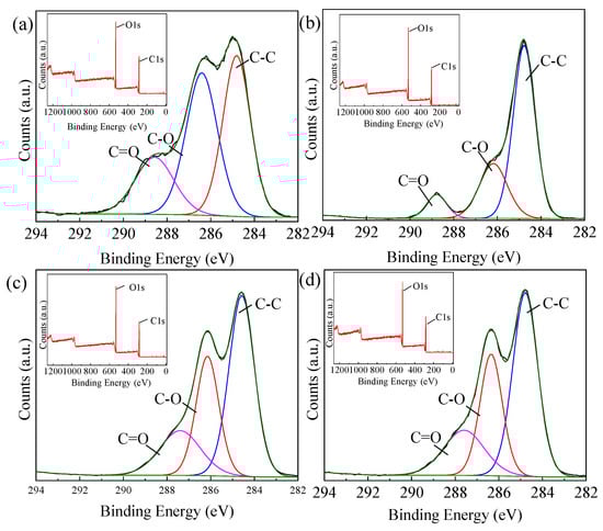 The typical bond dissociation energies and the results of the XPS test are shown in Table 1, Figure 4, and Table 2. According to Table 1, when the average electron temperature is too high (6.24 eV), the effect of plasma on the material’s surface is enhanced. Under the action of plasma, a large number of chemical bonds of LMA and the surface of the cotton fabrics were broken, resulting in a content increase of the C–C bond and a content decrease of the C=O and C–O bonds on the surface of the cotton fabrics (Figure 4a and Table 2). Further, the content increase of the C–C bond was the main chemical factor that improved the surface hydrophobicity of cotton fabrics.