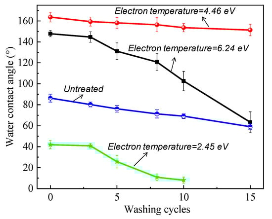 The corresponding washing durability of the cotton fabrics before and after plasma treatment, with electron temperatures of 6.24, 4.46, and 2.45 eV, was tested, and the results are shown in Figure 5. It was found that the properties of the washable fastness on the surface of the fabric after treatment at different electron temperatures were significantly different. When the electron temperature was 4.46 eV, the plasma-treated cotton fabric showed excellent water resistance (WCA = 151.28° after 15 washes). However, when the electron temperature was 6.24 and 4.46 eV, the plasma-treated cotton fabric showed hydrophilicity (WCA = 63.28°) and superhydrophilicity (WCA < 10°) after 15 washing cycles. Notably, when the electron temperature was 2.75 eV, the water repellency and washing durability of the plasma-treated cotton fabrics were lower than those of the untreated cotton fabrics. Combined with the above surface morphology and chemical composition analysis, the structural integrity and chemical bonding of the LMA film on the surface of the fabric was the main factor used to improve the water repellency and washable performance of the cotton fabric’s surface.