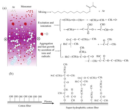 According to the XPS results, the possible reactions of the LMA-coated cotton fabric during the plasma treatment could be summarized, as shown in Figure 6. In the plasma reaction chamber, the argon and LMA monomer molecules were mixed first and then stimulated, ionized, aggregated, and developed quickly by the accretion of ions and radicals under the bombardment of the high-energy particles of plasma. Further, these active particles, such as free radicals, excited molecules, neutral molecules, ions, and energetic photons, acted on the surface of the cotton fabrics by radiation and collision via particle flux or ion beams and generated active sites on the surface of the cotton fabric and gas-phase free radicals in the chamber [26]. Under a proper average electron temperature (4.46 eV), the molecular bonds of the cotton fibers and LMA were broken (cotton: –C–O, C–C, and O–H bond; LMA: C–C, C=C, C–H, and C–O bond [26]). Small molecules like ·(CH2)x–CH3 or ·(CH2)n–O–CH2· polymerized by free radicals (as shown in Figure 6a) were deposited on the surface of the cotton fabrics and formed chemical bonds with their active sites (like C–O or C–C· [7]), as shown in Figure 6b. Then, they reacted with the existing polymer and finally formed a chemically bonded LMA film on the surface of the fabrics. In summary, the radicals in the chamber induced graft reactions on the cotton fiber surface and free radical polymerization of the LMA monomers, which greatly enhanced the bond between the fiber and coating layer and the intensity of the layer. When the average electron temperature was too high (6.24 eV) or too low (2.45 eV), the growth and polymerization of free radicals on the surface of cotton fabrics were affected. In summary, only when the electron temperature was within a certain range could the radicals in the chamber induce graft reactions on the cotton fiber surface and free radical polymerization of LMA monomers, which greatly improved the water repellency of the surface and bonding between the fiber and coating layer.