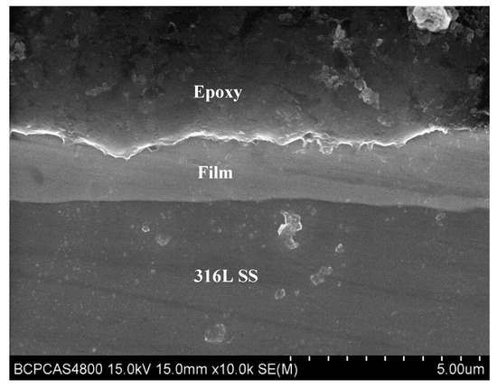 The hardness of the film was measured with an HM2000 micro-hardness tester (Fischer, Germany). The load was 20 mN, and the loading time was 20 s. For each sample, ten parallel tests were performed, and the average value was obtained. The adhesive strength between the film and the steel substrate was measured with a PosiTest Pull-off Adhesion Tester (DeFelsko) according to ISO (International Organization for Standardization) 4624-2002. The film porosity was evaluated by a filter paper method according to the standard QB/T (China light industry standard) 3823-1999 (the polarity measuring for metallic coatings).