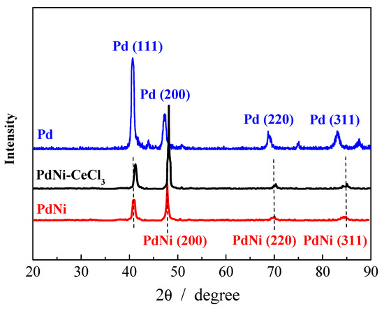 Figure 2 shows the X-ray diffraction pattern of the Pd-Ni film. The film showed a single phase FCC (Face-centered cubic) structure, indicating that a substitution solid solution formed during the electrodeposition. The addition of CeCl3 did not change the crystal type of the film. It can be seen from Figure 2 that the position of the Pd-Ni diffraction peak is close to but slightly shifted to the right of that of the pure Pd diffraction peak. This is because the lattice constant of Ni is smaller than that of Pd, and the Ni atom partially replaces the position of Pd in crystal, which resulted in the lattice constant of Pd-Ni decreasing compared with that of pure Pd. Table 3 shows the crystallite sizes of the Pd alloy films, as calculated by Scherrer equation. It can be seen that the crystallite size of the Pd-Ni film was reduced after CeCl3 addition, indicating that the addition of CeCl3 apparently decreased the crystallite size and refined the microstructure of the Pd-Ni film, which is in agreement with the results in the literature [16,17].