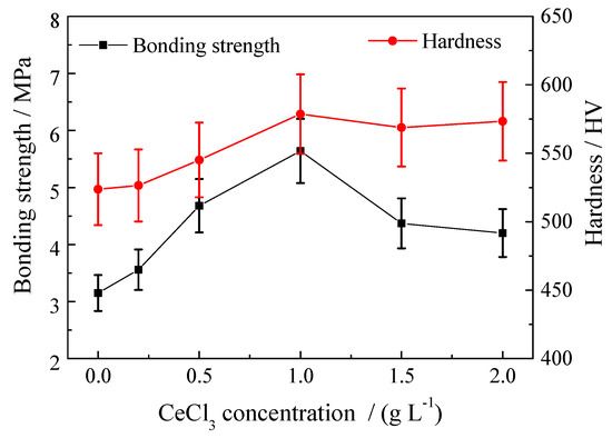 Figure 3 shows the micro-hardness and adhesive strength of the Pd-Ni alloy film that was obtained in the electrodeposition solutions that contained different concentrations of CeCl3. The hardness of the Pd-Ni film in the solution without CeCl3 was 524 HV. After CeCl3 addition, the hardness was improved, and it reached its maximum value (578.7 HV) when the CeCl3 concentration was 1.0 g L−1. The adhesive strength between the Pd-Ni film and the substrate was also significantly improved after the CeCl3 addition. With the CeCl3 concentration increasing, the adhesive strength firstly increased and then decreased; it achieved a maximum (5.64 MPa) at around 1.0 g L−1 of CeCl3 addition in the electroplating solution. This shows that adding proper concentration of CeCl3 can enhance the adhesive strength between a film and a substrate, thereby increase the protective effect of a film to a substrate. It can be noted that the adhesive strength and hardness of the Pd-Ni film had the same variation tendency with the concentration of CeCl3 in the plating solution. This was probably because that the addition of cerium salt could refine the film’s grain size, reduce the film’s pinholes during deposition, and make the surface of the film more compact and uniform [16,17]. These would have resulted in an enhanced bonding force [16]. Meanwhile, according to the Hall–Petch relationship, the micro-hardness of the film was also improved as the result of the grain refinement [18,19]. However, the excessive addition of cerium salt could have degraded the homogeneity of the film, which resulted in the decrease of the hardness and the adhesive force of the film. This is in agreement with the results of some of the literature [16,17].