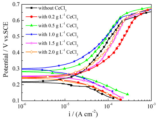 Polarization curves of the plated samples in the solutions with different contents of CeCl3.