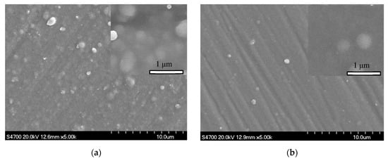 From the above test results, it can be noted that the Pd-Ni film that was deposited in the solution when the CeCl3 content was 1.0 g L−1 presented better performances. The surface morphology of the Pd-Ni film was observed by SEM and is shown in Figure 5, where it is compared with the morphology of the film in the solution without CeCl3. It could be seen that after 1.0 g L−1 CeCl3 was added, the surface of the Pd-Ni film was more homogeneous and continuous, with less rough particles covered on the surface. As we know, the process of electroplating mainly comprises the absorption and the reduction of cations on the surface of the cathode. Cerium is a surface active element with a large atomic radium (0.1824 nm), a unique 4f electron configuration, and a strong adsorption ability. When CeCl3 is added to a plating solution, Ce3+ is preferentially adsorbed on the crystal defects of the cathode and obstructs the reduction of metal cations on the cathode surface [17]; this needs a high cathodic potential to supply the reduction energy of Pd (NH3)22+ and Ni (NH3)22+, so the nucleation rate of the new crystallite is increased and then grains are refined [19].